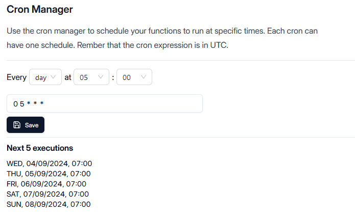 Use the cron manager to schedule functions to run at specific times. This allows you to execute mutations at specific times, generate reports and send them by e-mail, or any other scheduled task. A task may run as often as every half hour.